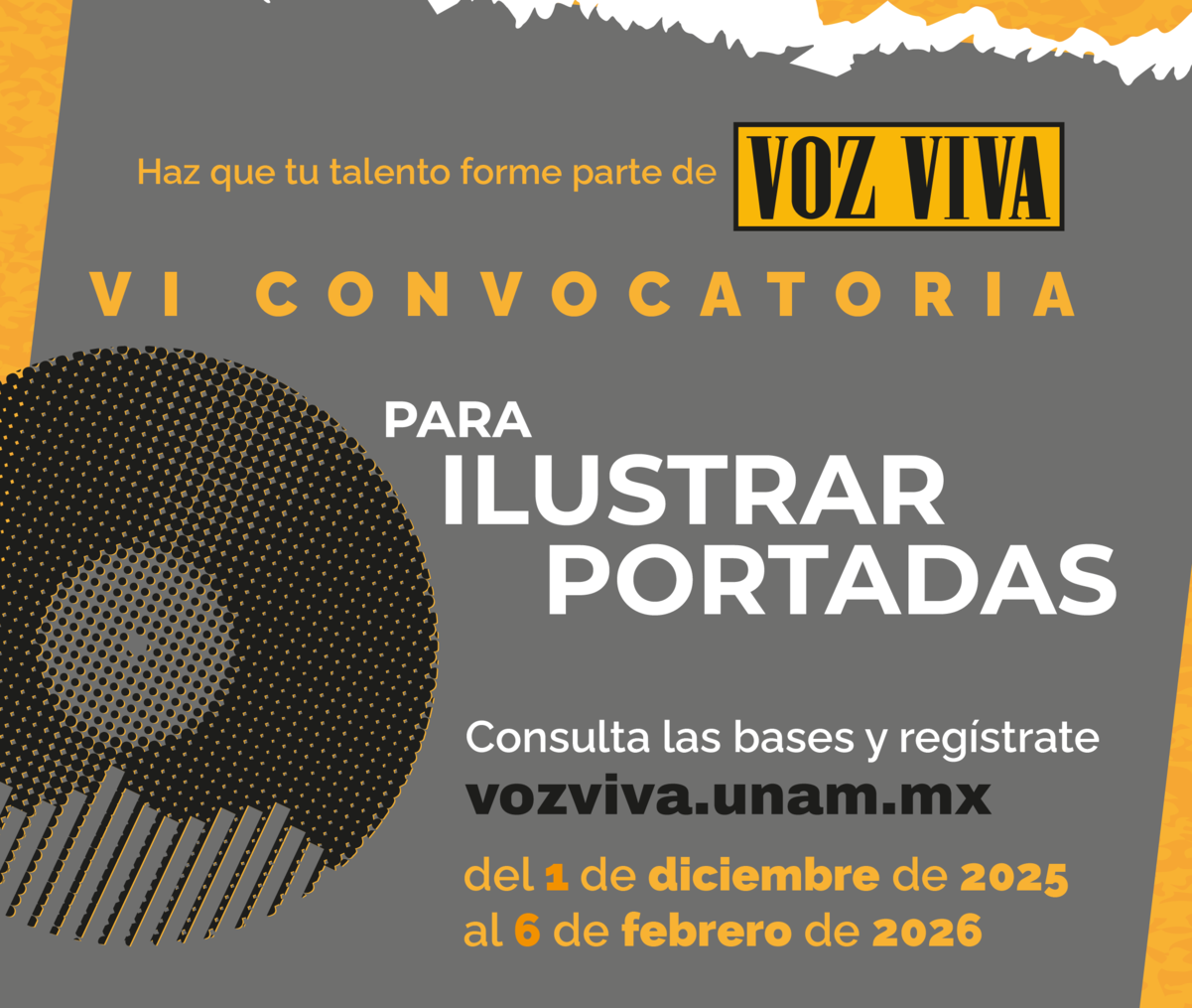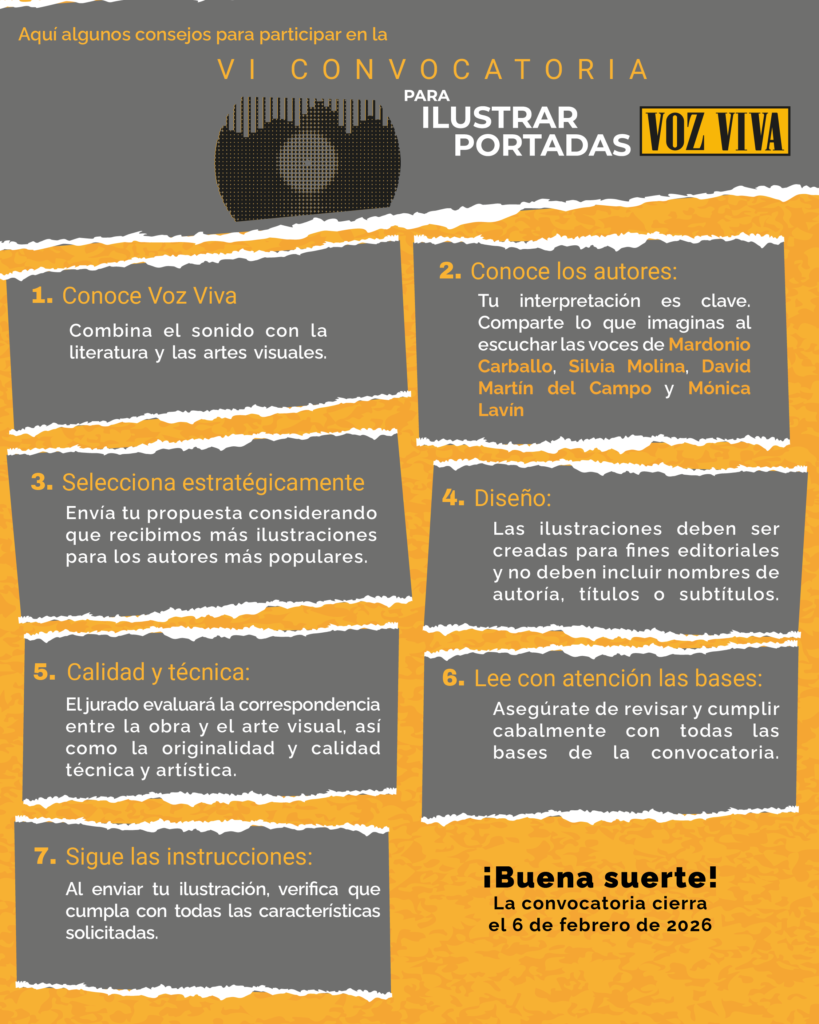 La Universidad Nacional Autónoma de México, a través del proyecto Voz Viva, abrió la VI Convocatoria para ilustrar las portadas de su emblemática colección sonora. Esta iniciativa invita a ilustradoras, ilustradores y creadores visuales a dialogar con la literatura contemporánea mediante una propuesta gráfica que acompañe la voz de autoras y autores fundamentales de nuestro tiempo.